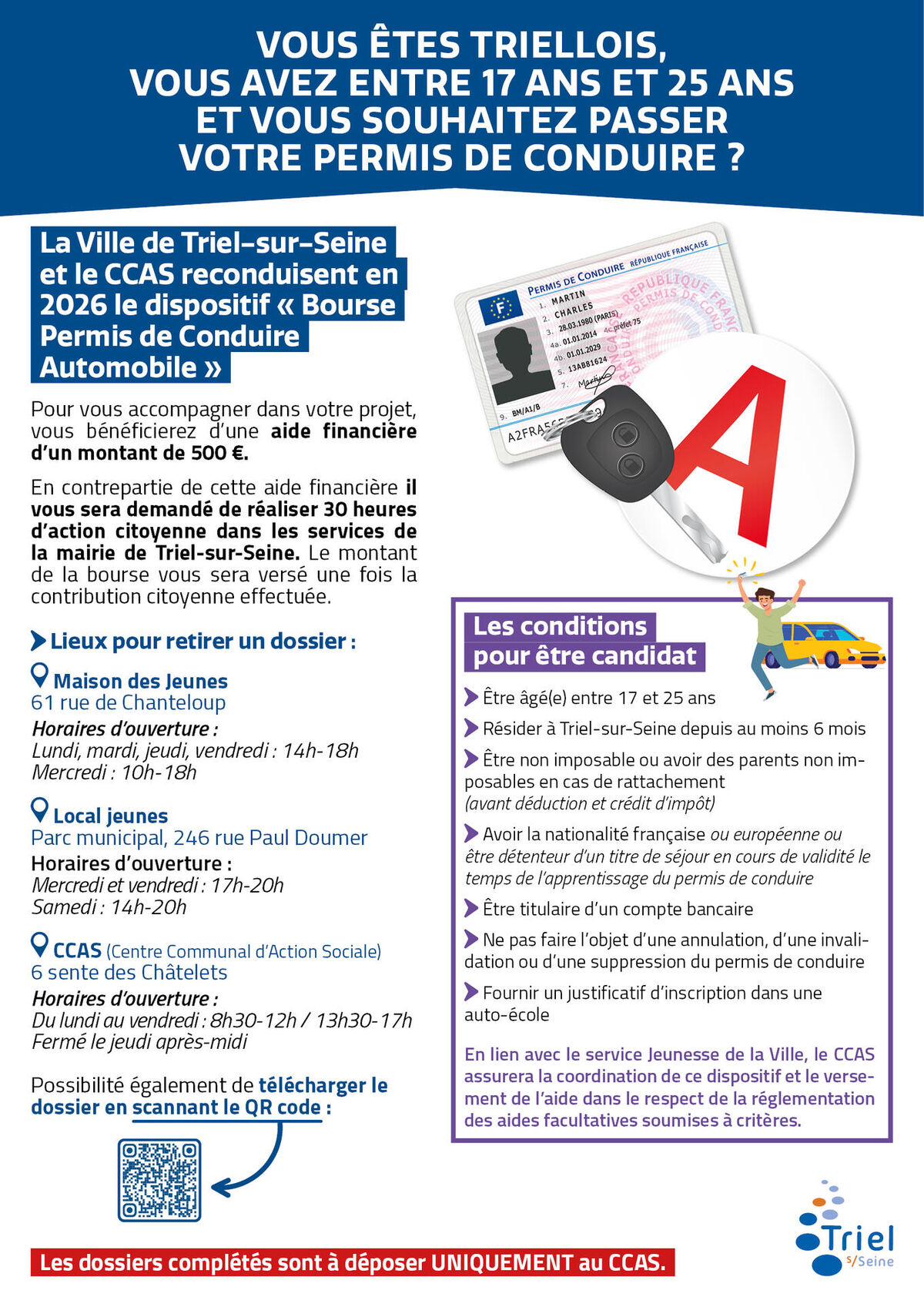 Dans le cadre de ses compétences d’aide sociale, le CCAS et la Ville de Triel-sur-Seine ont mis en place en 2022 le dispositif "Bourse Permis de Conduire Automobile" pour accompagner les jeunes triellois âgés de 17 à 25 ans désireux d’obtenir leur permis de conduire.