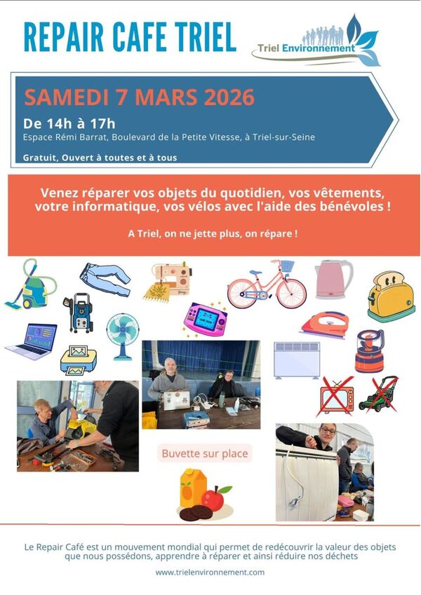 Triel Environnement vous invite au Repair Café le samedi 7 mars, de 14h à 17h, à l’espace Rémi Barrat. Ne jetez plus, venez le faire réparer !