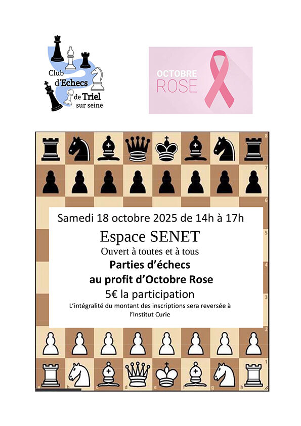 Organisé par le club d'échecs de Triel, samedi 18 octobre de 14h à 17h à l'espace Senet. Au profit d’Octobre Rose. Ouvert à tous.