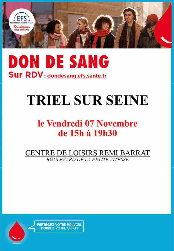 L’Établissement Français du Sang et les bénévoles attendent les Triellois nombreux à l'espace Rémi Barrat le vendredi 7 novembre, de 15h à 19h30. Donnez votre sang, sauvez des vies !
