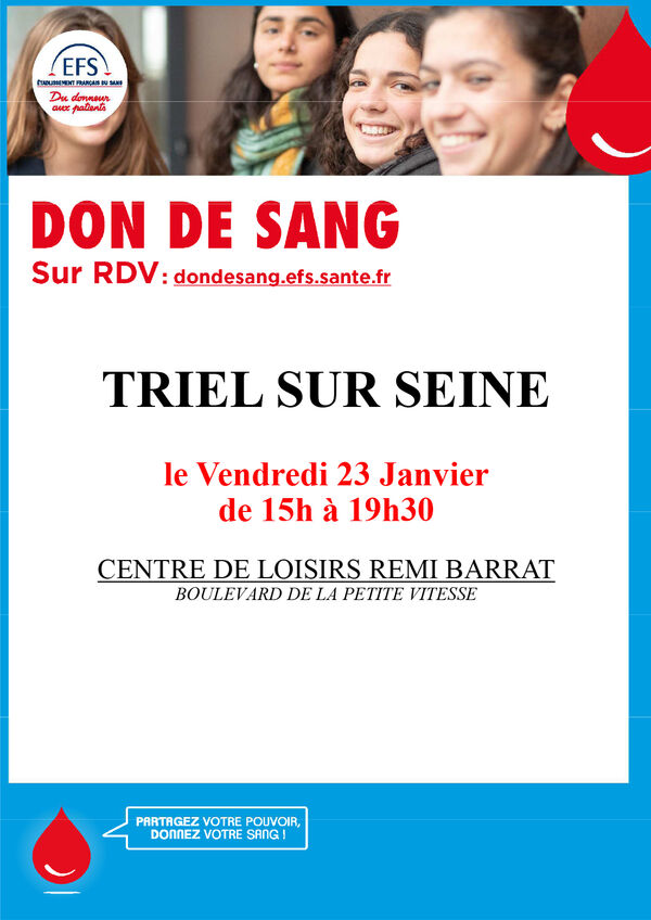 L’Établissement Français du Sang et les bénévoles attendent les Triellois nombreux à l'espace Rémi Barrat le vendredi 23 janvier, de 15h à 19h30. Donnez votre sang, sauvez des vies !