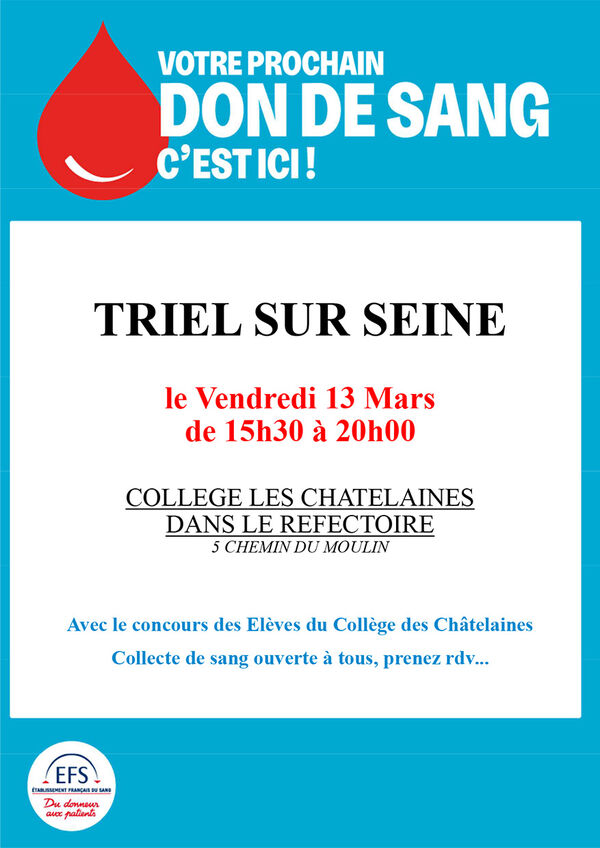 L’Établissement Français du Sang et les bénévoles attendent les Triellois nombreux au collège des Châtelaines le vendredi 13 mars, de 15h30 à 20h. Donnez votre sang, sauvez des vies !