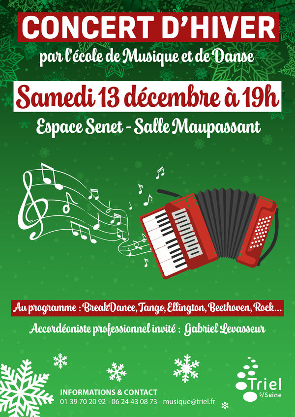 L'école municipale de Musique et de Danse vous propose un concert samedi 13 décembre à partir de 19h à l'espace Senet. Entrée libre.