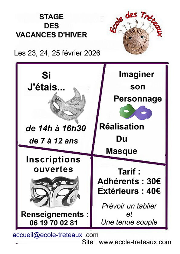 L'Ecole des Tréteaux organise un stage les lundi 23, mardi 24 et mercredi 25 février, de 14h à 16h30, pour les enfants de 7 à 12 ans.