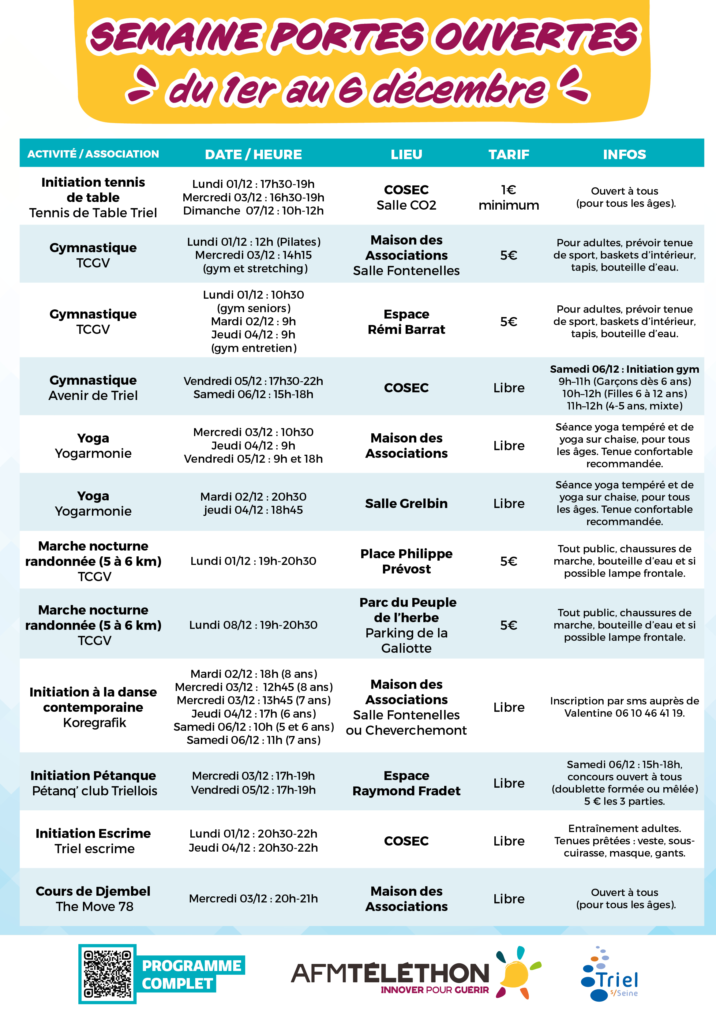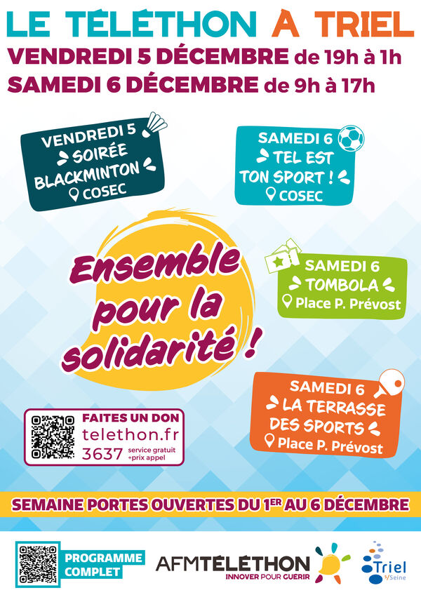 Cette année encore, Triel et ses associations se mobilisent pour le Téléthon. Rendez-vous le vendredi 5 et samedi 6 décembre, au COSEC et sur la place Philippe Prévost. Au programme : de nombreuses animations, tombola, stands de restauration, boîtes à dons... On compte sur vous !