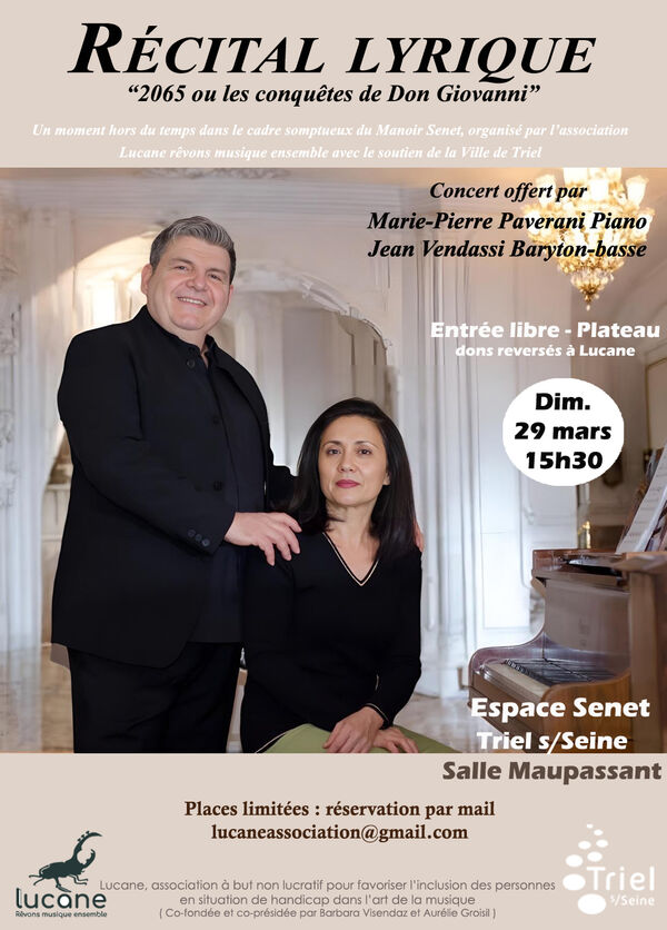 Concert de récital lyrique "2065 ou les conquêtes de Don Giovanni" dimanche 29 mars à 15h30 à l'espace Senet, organisé par l'association "Lucane rêvons musique ensemble" avec le soutien de la Ville de Triel.