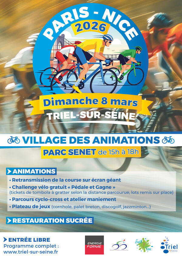 La Ville organise un village d'animations le dimanche 8 mars, de 15h à 18h, au parc Senet à l'occasion du passage de la célèbre course cycliste Paris-Nice à Triel-sur-Seine.