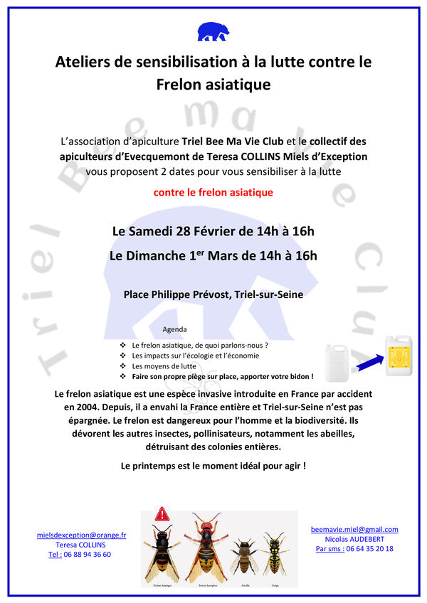 Le frelon asiatique est une espèce invasive particulièrement dangereuse pour nos abeilles et nos écosystèmes. Pour mieux comprendre les enjeux liés à sa prolifération et agir ensemble, le club d’apiculture "Triel Bee Ma Vie", en partenariat avec le collectif des apiculteurs d'Evecquemont "Miels d'Exception", vous invite à deux ateliers de sensibilisation :