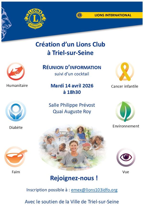 Le Lions Club organise une réunion d'information concernant la création d'un Lions Club à Triel-sur-Seine le mardi 14 avril à 18h30 salle Philippe Prévost.